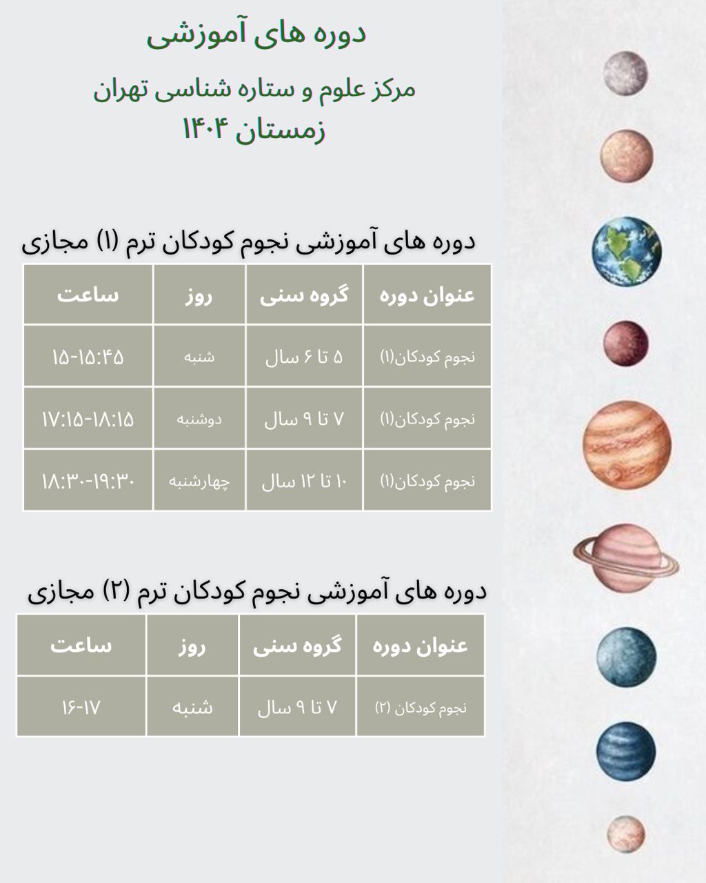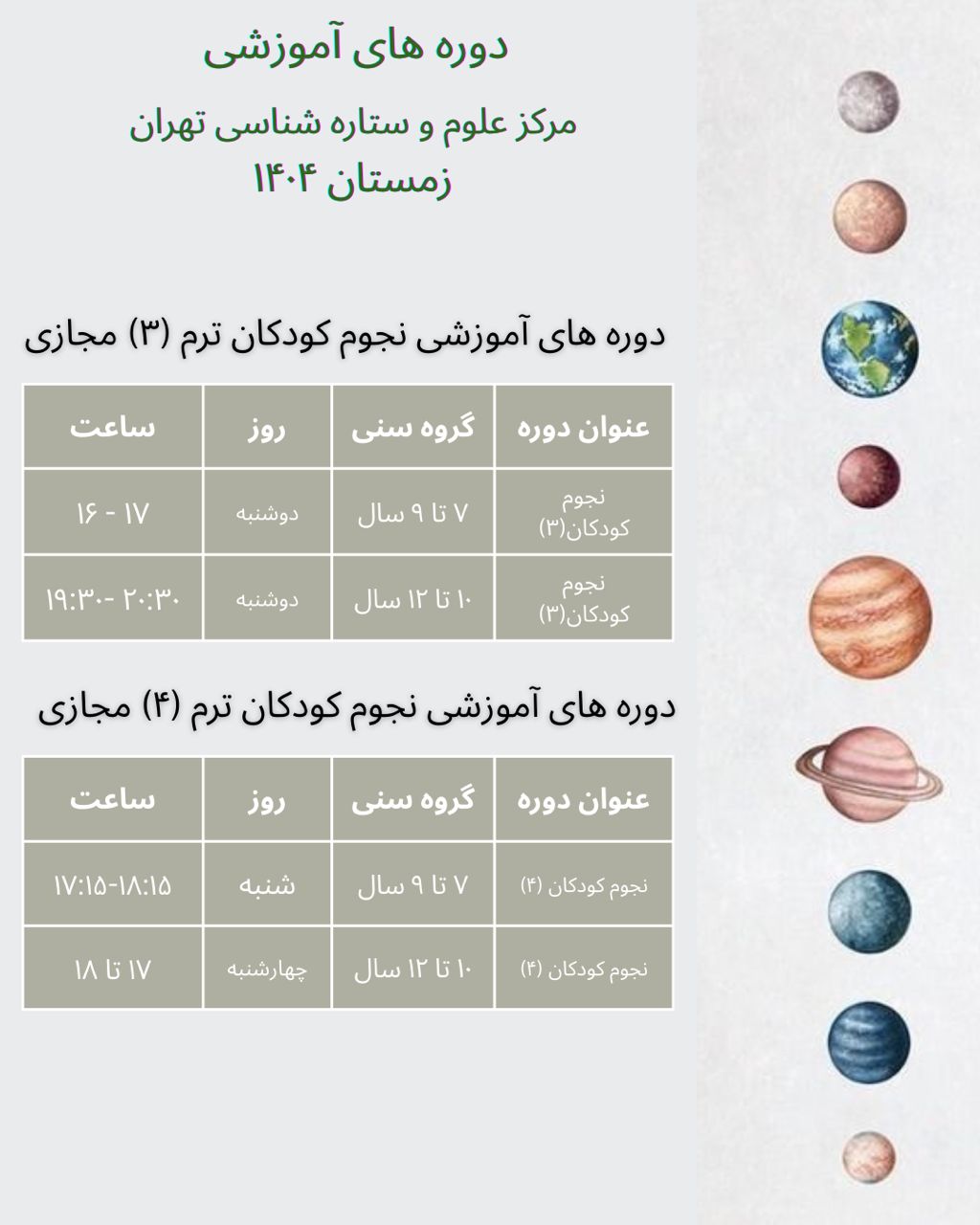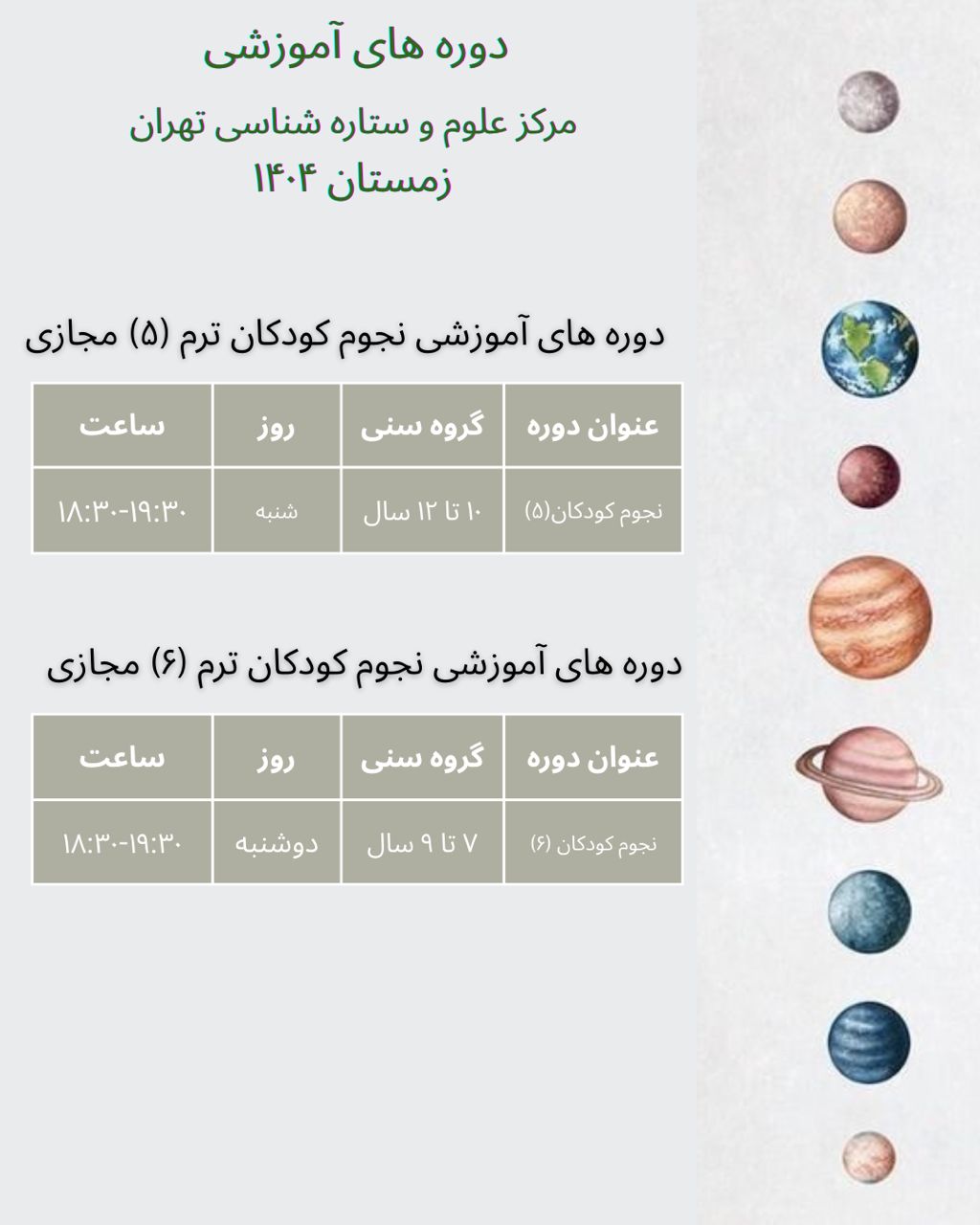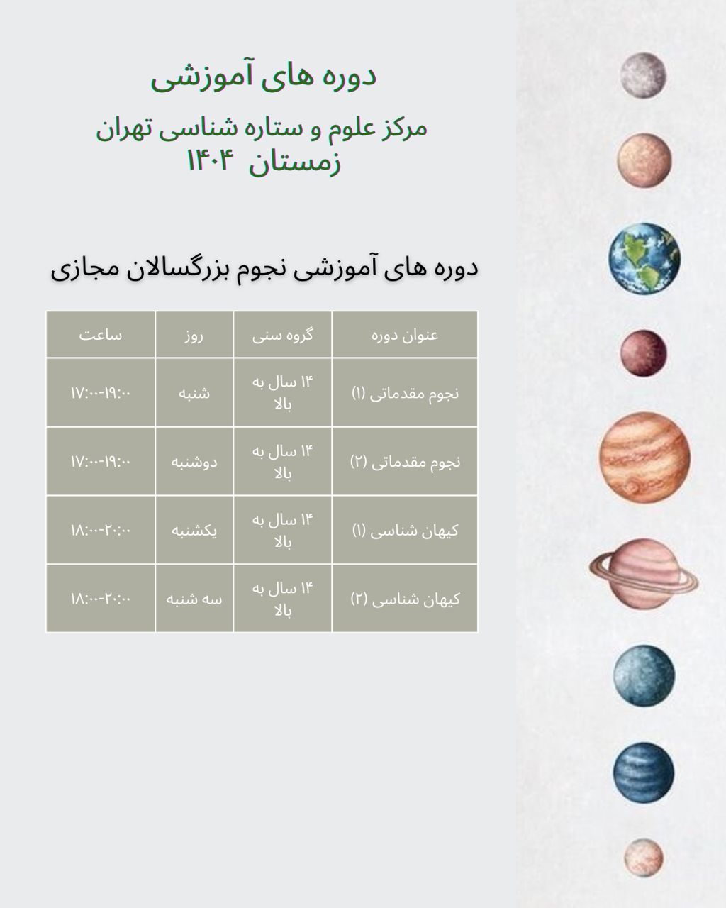 علاقمندان می توانند جهت ثبت نام در روزهای شنبه تا چهارشنبه از ساعت 8:30 الی 16:00 با واحد آموزش مرکز علوم وستاره شناسی تهران به شماره 96027657-021 تماس حاصل نمایند.
